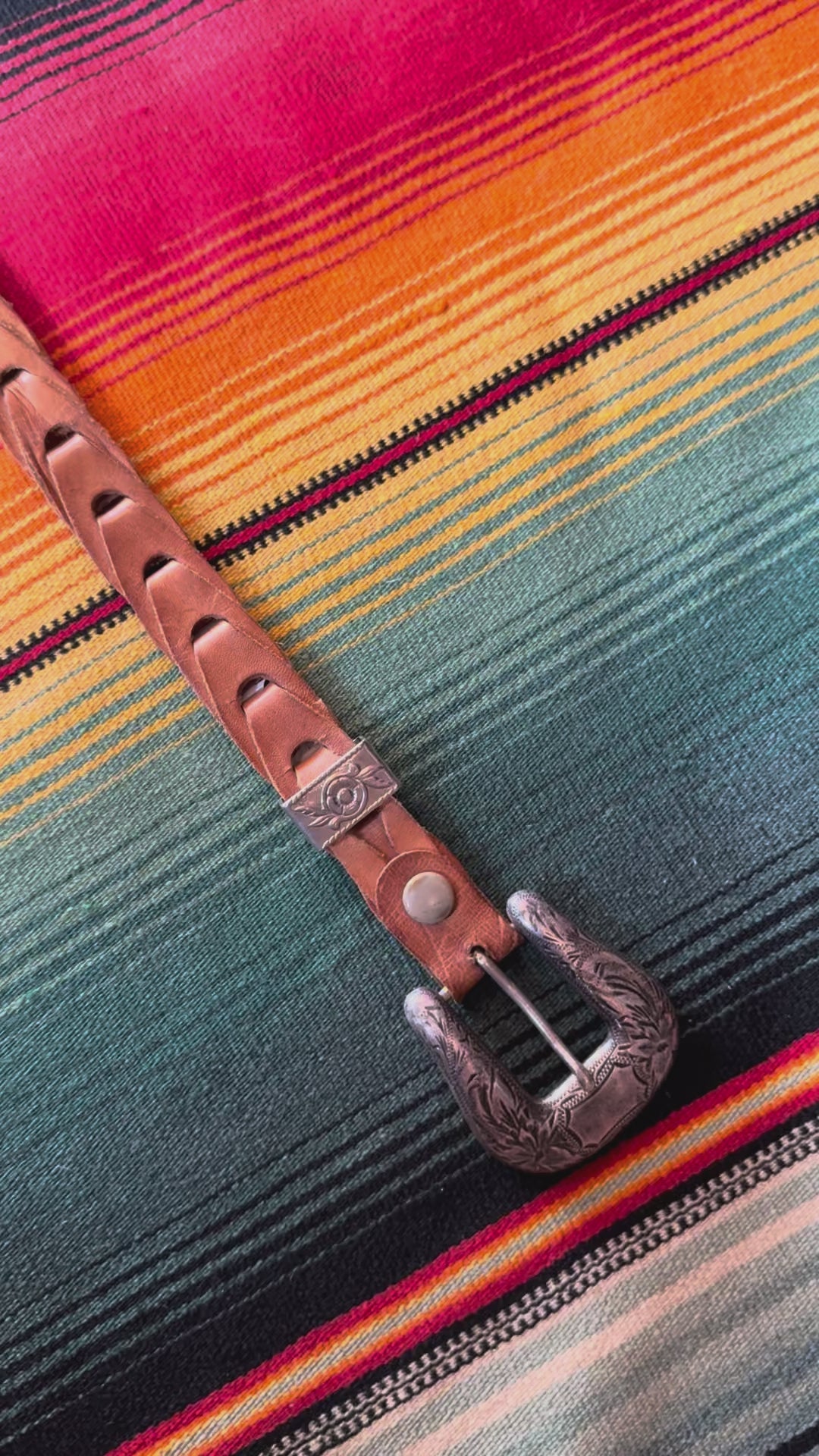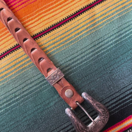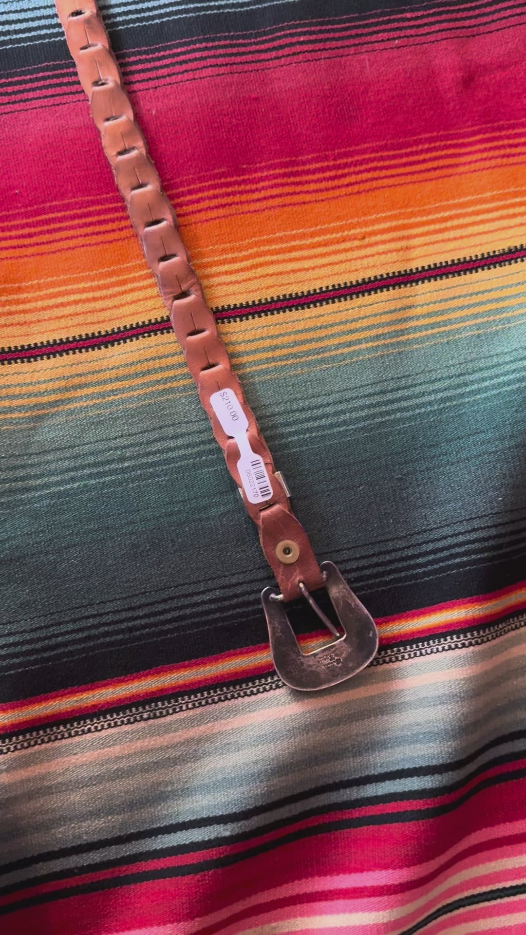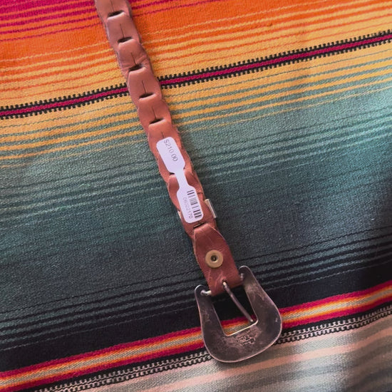 Timeless tan braided leather belt with sterling hardware by Sunset Trails. No belt holes. Measures 37" end to end, probably best for a women's small to medium.