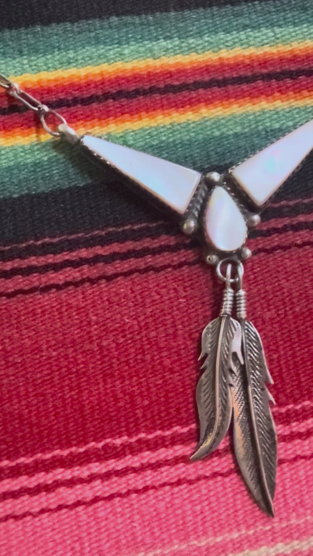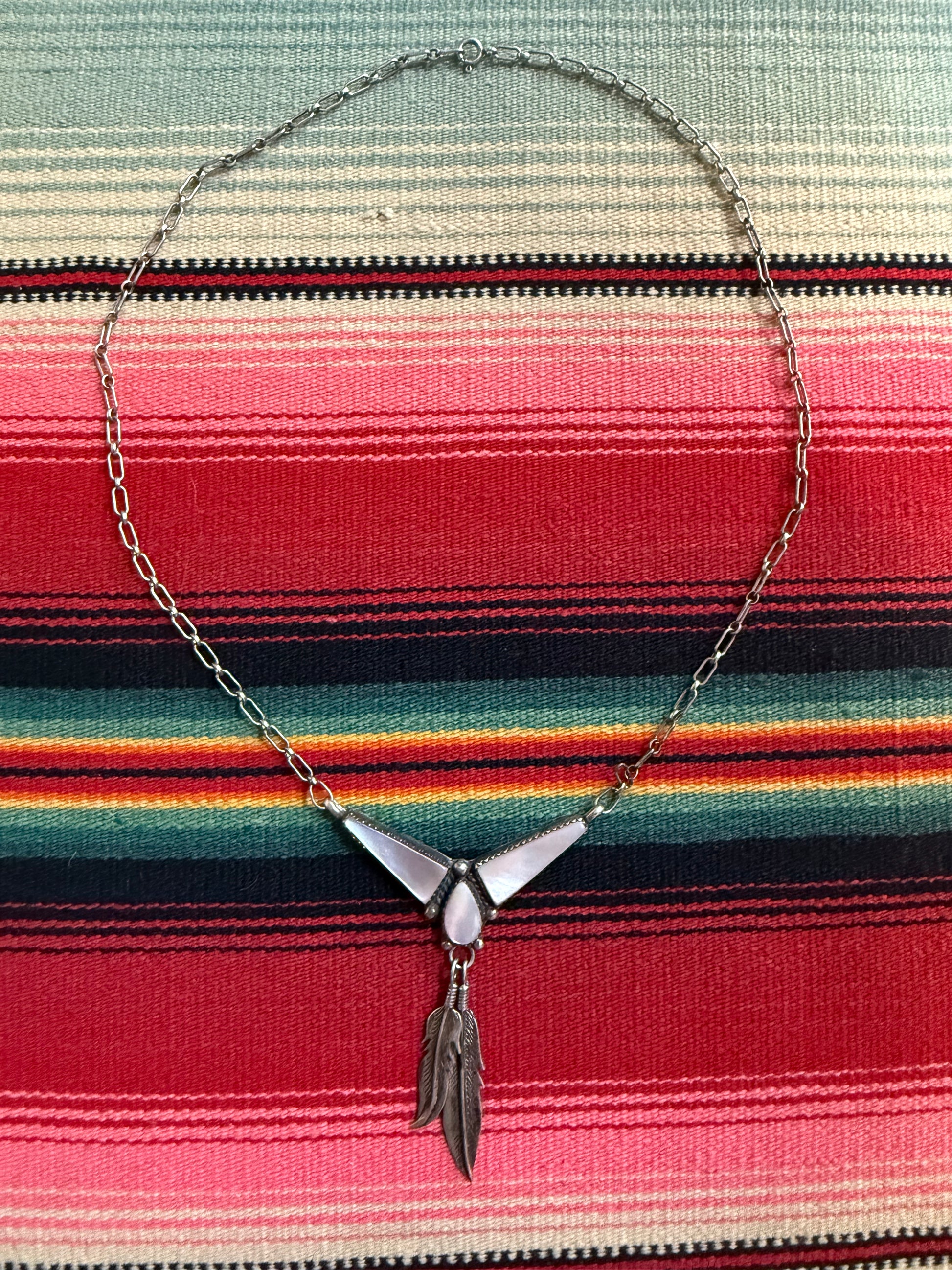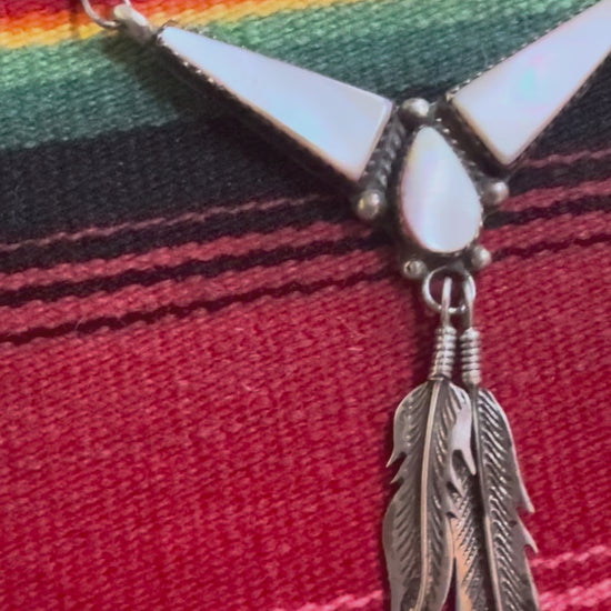 Vintage Sterling and Mother of Pearl Feather Pendant with Chain 8”